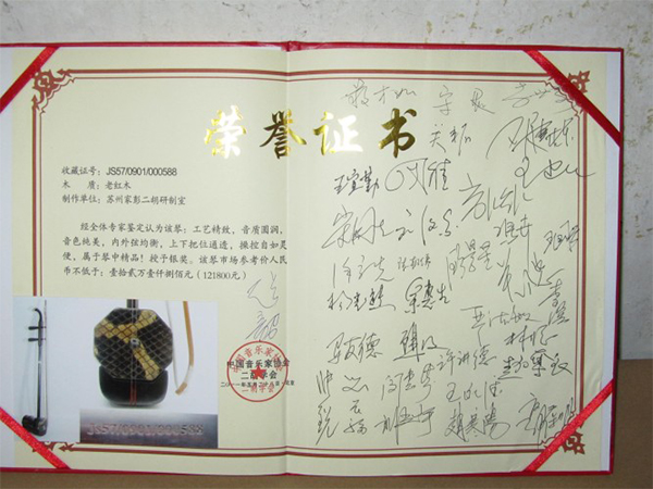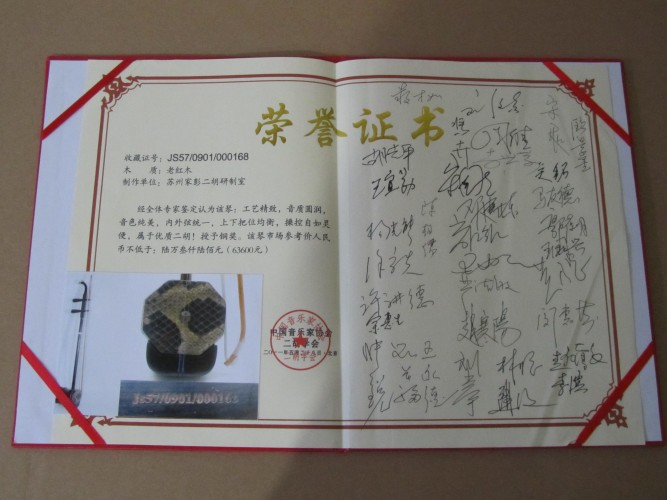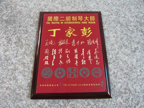 二胡制作大師丁家彭先生1949年出生樂器世家,17歲隨其祖父學(xué)琴藝,并深得精髓,其聰穎好學(xué),悉心鉆研與 探求二胡制作,博得同行的欽佩贊許,更得了許多知名演奏家的稱贊,充分認識到二胡制作每個環(huán)節(jié),都對二胡制作都有影響力,因此對二胡的選材,選料,蟒皮都十分嚴格,二胡整體穩(wěn)定性良好,環(huán)境干擾影響極小。